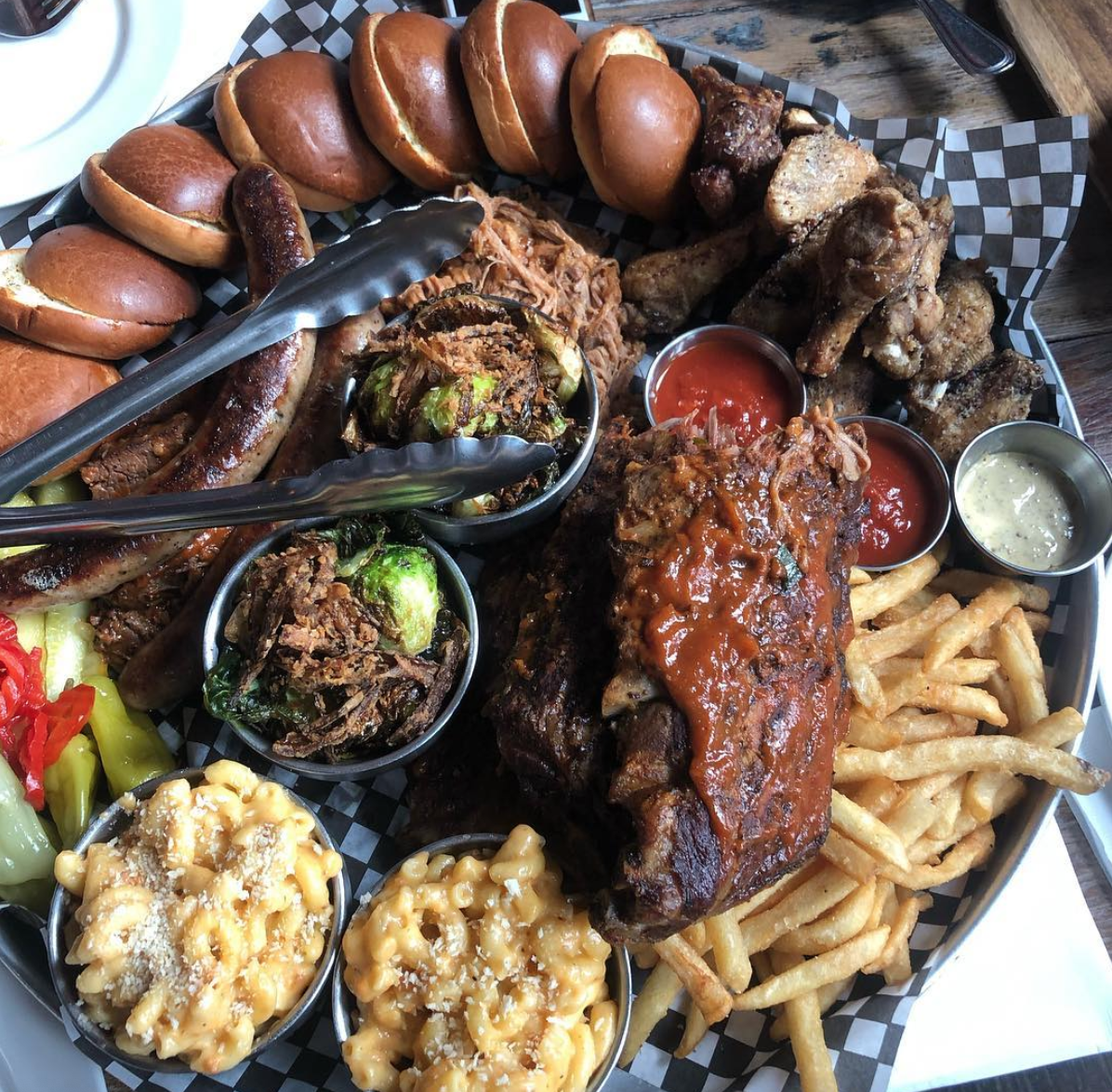 beef brsket, pulled pork, pork back ribs, 1.5 lbs of chicken wings, beer sausage, creole mustard, mini buns, pickled veg > choose 6 sides